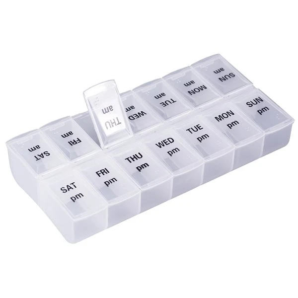 Keep medications, vitamins, and supplements, organized twice daily with this pill organizer. The advantages of this organizer include a transparent plastic design for clear visibility, portable structure, and flip-top lid for quick and easy use and closure. It includes 14 compartments that include a weekly AM and PM time frame.