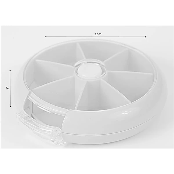 Keep medications, vitamins, and supplements, organized with this round pill organizer. The advantages of this organizer include a clear sturdy plastic lid for secure closure, portable structure, and centre button for lid removal. It includes 2 round compartments divided into 7 sections for every day of the week.