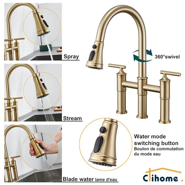 This upgraded pull down kitchen Faucet with double handle will bring you an excellent kitchen cleaning experience. The 360 swivel spout can help you clean up any corner flexibly.