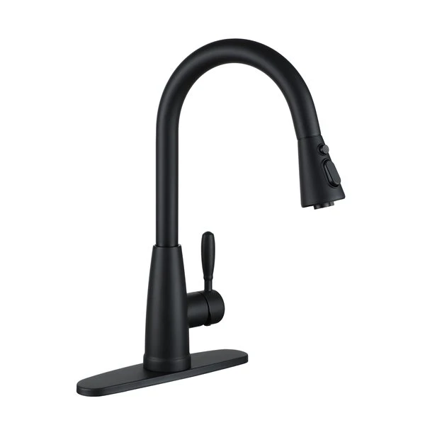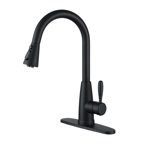 This pull-down kitchen faucet has a sleek profile and unobstructed lines. The main body is a zinc-clad brass, low-lead construction that adds elegance and beauty to this single-handle faucet. Its seamless gooseneck and high arch provide plenty of room for cleaning or filling large pots and pans. Its tri-functional spray head offers three water discharge modes that can be switched freely. The water line is thin to effectively prevent spills.