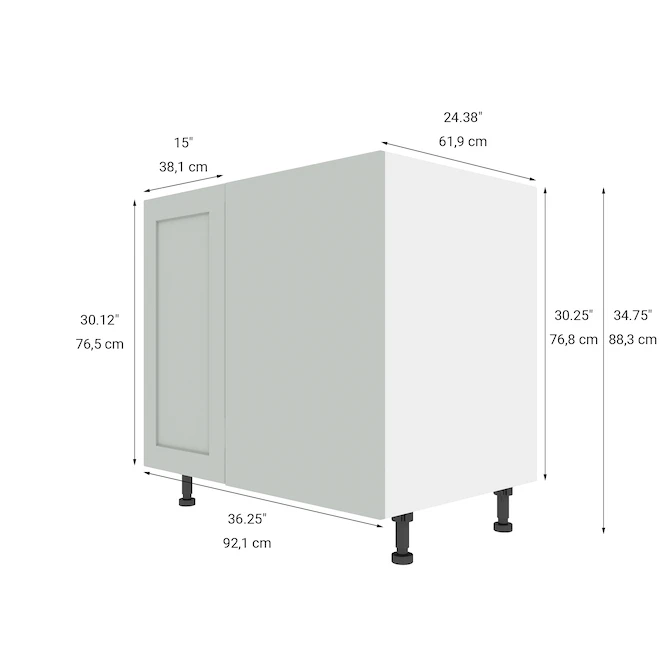 This Eklipse by EBSU 36-inch base hidden corner cabinet features a single soft-close grey polymer door and adjustable legs for more convenience. This cabinet is pre-assembled and ready to install, and its frameless design offers more storage space. It can be paired with other units from Eklipse to complete your kitchen. This product is made in Canada.