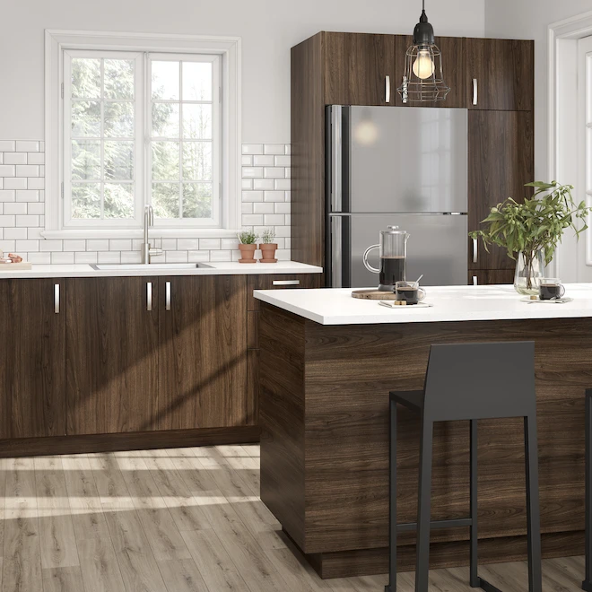 - Melamine door front in walnut woodgrain finish with 3/4-In melamine panel construction