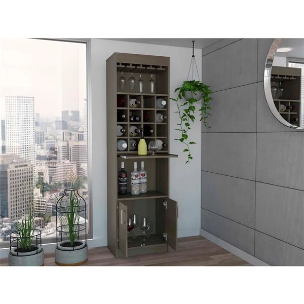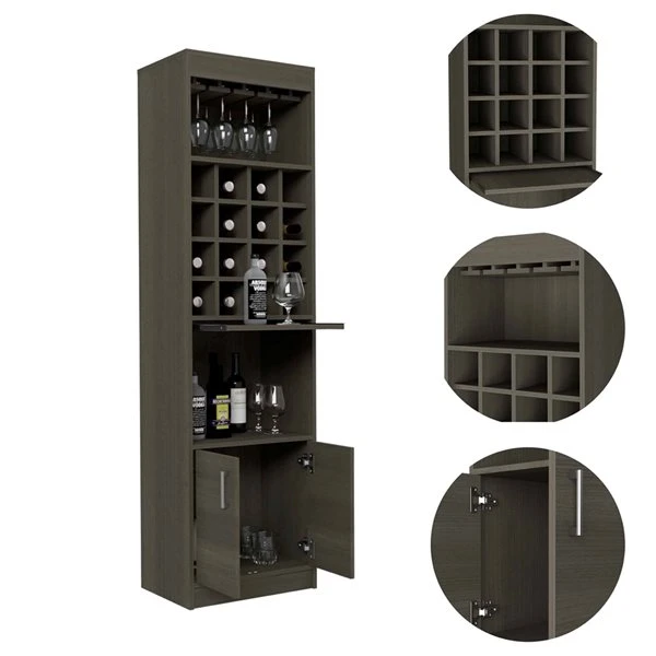 This bar cabinet made of particle board will provide significant storage space, enough for liquor bottles and glasses to keep the fun going until dawn. It will also add a touch of elegance and modernity to any room where you place it. With sixteen cubbies for liquor or wine bottles, a rack for eight wine glasses, an open area below to display your prized liquor and a cabinet at the bottom to keep other items, this tall bar cabinet surely can come in handy. Its functional design will allow you to have anything to keep the party going you need in one place.