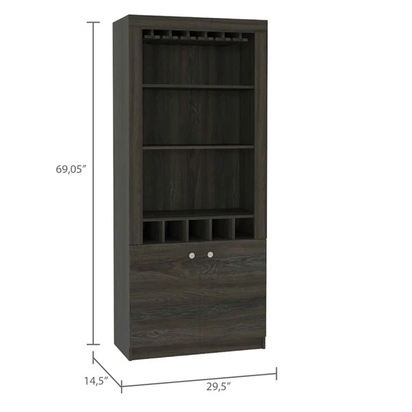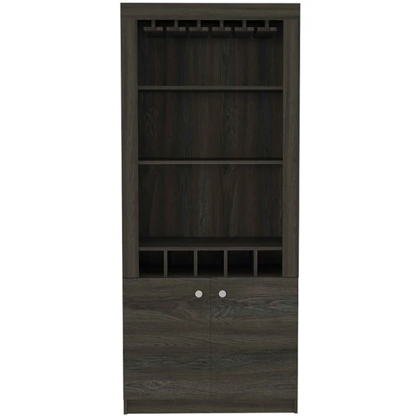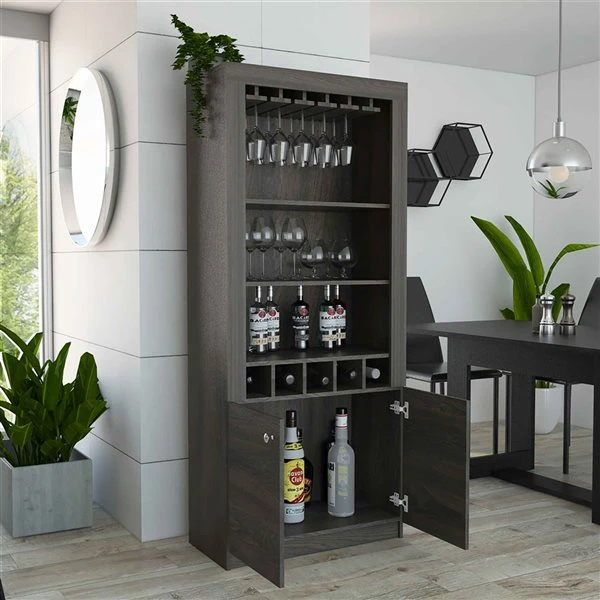 This spacious bar cabinet made of particle board easily fits into any space. With its impeccable design, it is perfect for any social event. This bar cabinet will provide great storage spacious enough for liquor bottles, and glasses. It will also add a touch of elegance and modernity to any room you place it in. It features a rack for ten wine glasses, two open shelves to display items and five bottle cubbies. The bottom cabinet can store larger bottles or items.
