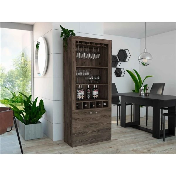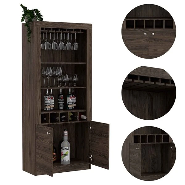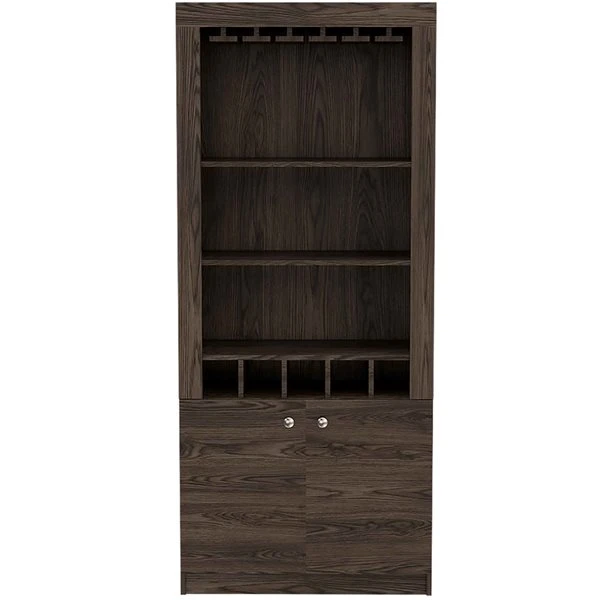 This spacious bar cabinet made of particle board easily fits into any space. With its impeccable design, it is perfect for any social event. This bar cabinet will provide great storage spacious enough for liquor bottles, and glasses. It will also add a touch of elegance and modernity to any room you place it in. It features a rack for ten wine glasses, two open shelves to display items and five bottle cubbies. The bottom cabinet can store larger bottles or items.