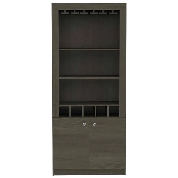 This spacious bar cabinet made of particle board easily fits into any space. With its impeccable design, it is perfect for any social event. This bar cabinet will provide great storage spacious enough for liquor bottles, and glasses. It will also add a touch of elegance and modernity to any room you place it in. It features a rack for ten wine glasses, two open shelves to display items and five bottle cubbies. The bottom cabinet can store larger bottles or items.