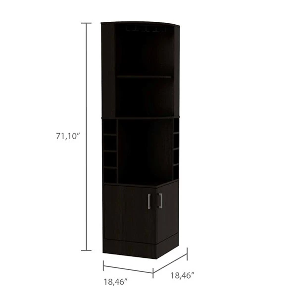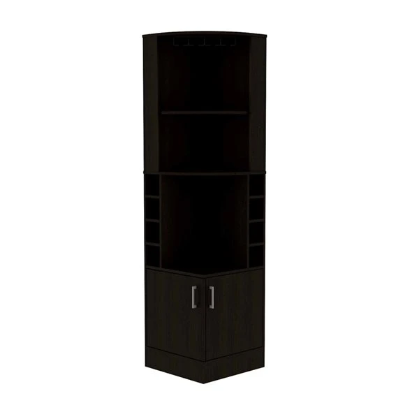 This Seattle bar cabinet made of particle board is a piece of furniture designed for the best functionality possible, the first thing you will notice is the corner cabinet design which fits perfectly in most spaces. The two top shelves are a great feature to display decorative items or put your open bottles while you entertain your guest. This cabinet also features four cubbies made for standard-size bottles and a central open shelf on each side. The bottom two-door cabinet allows you to conceal your large items.