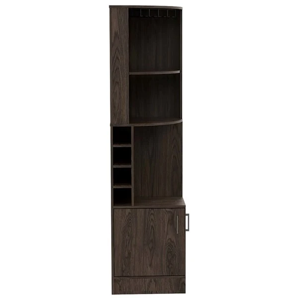 This Seattle bar cabinet made of particle board is a piece of furniture designed for the best functionality possible, the first thing you will notice is the corner cabinet design which fits perfectly in most spaces. The two top shelves are a great feature to display decorative items or put your open bottles while you entertain your guest. This cabinet also features four cubbies made for standard-size bottles and a central open shelf on each side. The bottom two-door cabinet allows you to conceal your large items.
