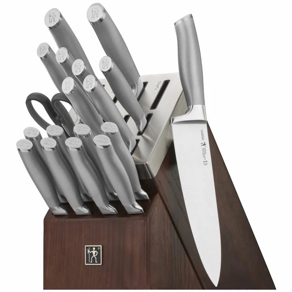 Form meets function in the striking Modernist series. The fully forged bolster construction seamlessly transitions from blade to handle for durability and balance. Fabricated from high-quality German stainless steel, the satin-finished blade produces precision cuts and is honed for long-lasting sharpness. Equally ergonomic and stylish, the hollow stainless steel handle is wonderfully lightweight. Its fingerprint-proof sandblasted texture is easy to grip and is beautifully finished with a polished, logo-embossed end. Enjoy effortless cutting and cleanup with these dishwasher-safe knives. The self-sharpening knife block slots boast built-in ceramic honing wheels that automatically sharpen when knives are stored or removed.