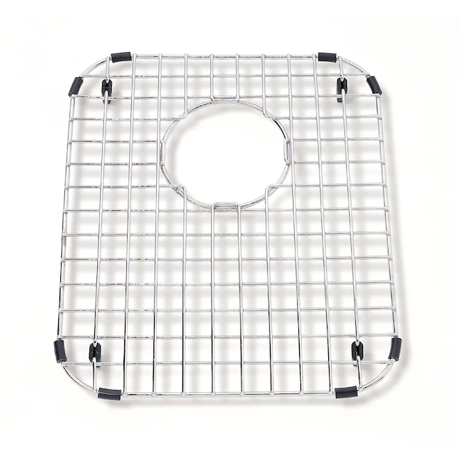 Stainless steel bottom grid to protect sink bowl from scratches. Includes rubber feet, side bumpers, and hole access to sink waste hole. Dishwasher safe and heat resistant.