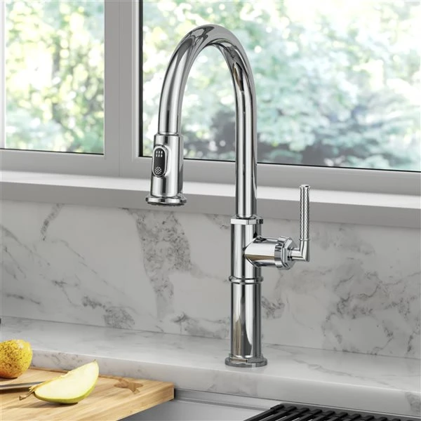 The Allyn traditional pull-down faucet incorporates hexagonal bolt details and a diamond-knurled handle grip to create a distinctive look. A pull-down spray head with Reach Technology offers easy manoeuvrability and an extended range of motion. The dual function sprayer switches from aerated stream to powerful spray for all your kitchen tasks. Soft rubber spray nozzles allow you to wipe away any mineral build-up. A high-arc spout offers ample space in the sink for large cookware and tall pitchers, and swivels 360 degrees for a full range of motion. The single lever handle operates with 90 degrees forward rotation. The robust design features a heavy-duty metal body and premium components including a high-quality ceramic cartridge, snap-on counterweight, and easy-to-install quick connect sprayer hose.