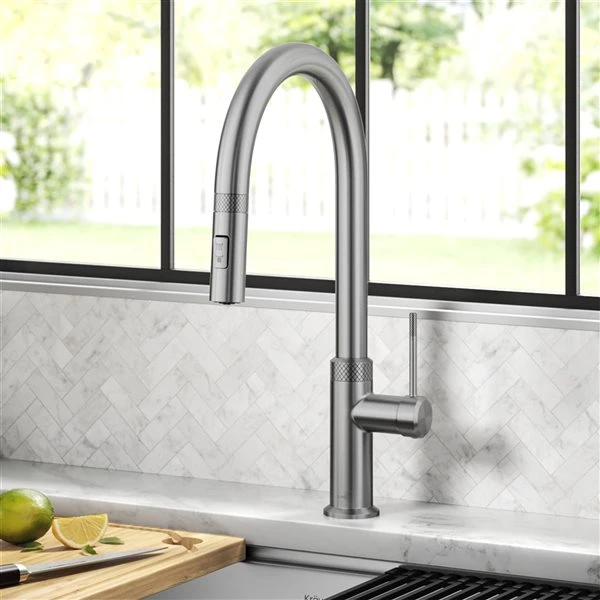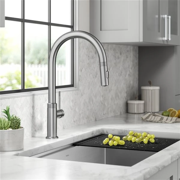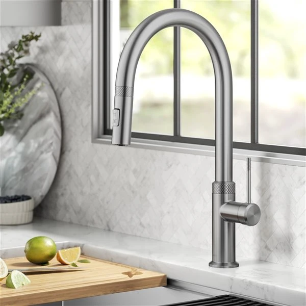 The Allyn modern pull-down faucet combines a streamlined contemporary silhouette with beautifully textured diamond-knurled details. A pull-down spray head with Reach Technology offers easy manoeuvrability and an extended range of motion. The dual function sprayer switches from aerated stream to powerful spray for all your kitchen tasks. Soft rubber spray nozzles allow you to wipe away any mineral build-up. A high-arc spout offers ample space in the sink for large cookware and tall pitchers, and swivels 360 degrees for a full range of motion. The slim single lever handle operates with 90 degrees forward rotation. The robust design features a heavy-duty metal body and premium components including a high-quality ceramic cartridge, snap-on counterweight, and easy-to-install quick connect sprayer hose.