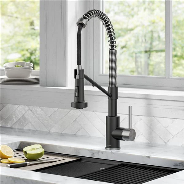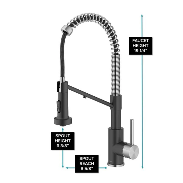 - Commercial pull-down design creates a professional look with an industrial open-coil spout and offers the convenience of a pull-down sprayhead