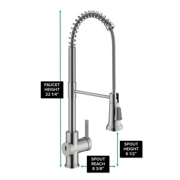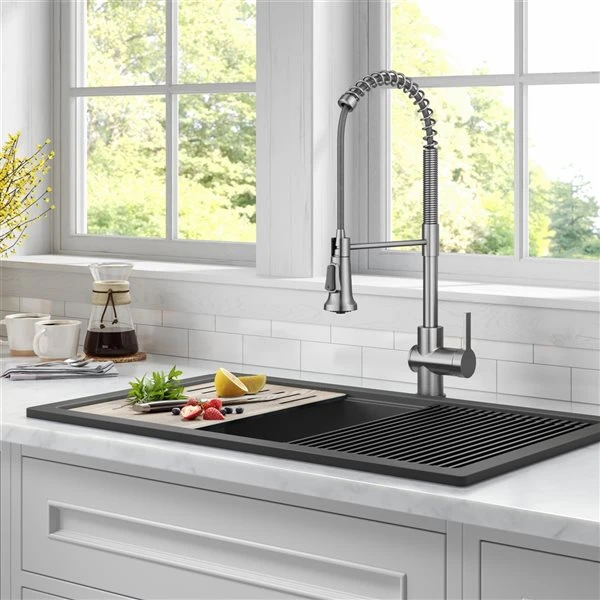 - Commercial pull-down design that creates a professional look with an industrial open-coil spout, and provides the convenience of a pull-down spray head with an extended range of motion