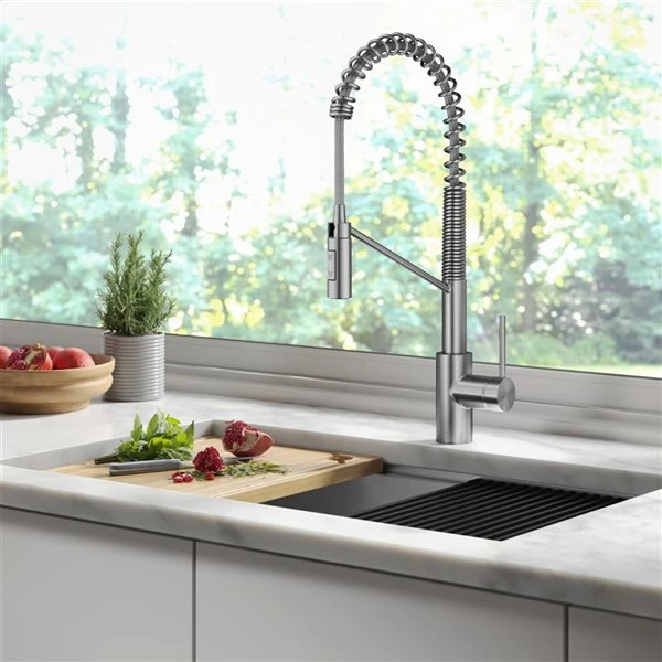 - Commercial pull-down design that creates a professional look with an industrial open-coil spout, and provides the convenience of a pull-down spray head with an extended range of motion