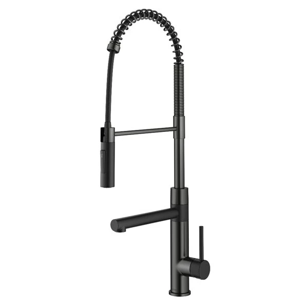 - Commercial-style faucet with an industrial open-coil spout, pull-down sprayer, and rotating pot filler offers a distinctively professional look