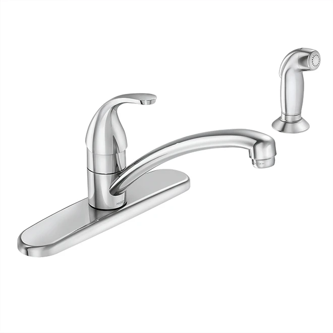 This single-lever sleek-design faucet of the Adler collection by Moen® is a practical addition to your kitchen. Its mirrorlike chrome finish and sleek design gives it an ageless yet elegant touch that matches all styles. It has a separate side spray that connects directly onto the valve body. The faucet features an aerated stream for everyday cleaning. It requires a 4-hole installation and can be mounted on the sink or on a countertop. Its easy installation requires no tools. This product is backed by a lifetime limited warranty.