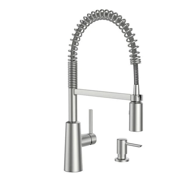 Cleaning large pots will be a breeze with this Nori kitchen faucet by Moen. It features a high arc spout and a pullout wand. It is equipped with a Reflex system for smooth operation and secure docking of the pulldown/pullout spray head. This brushed stainless steel faucet has a single lever handle, which takes up less space on your countertop than traditional two-lever faucets. PowerClean spray technology helps make everyday cleaning tasks a breeze. It even includes a soap dispenser.