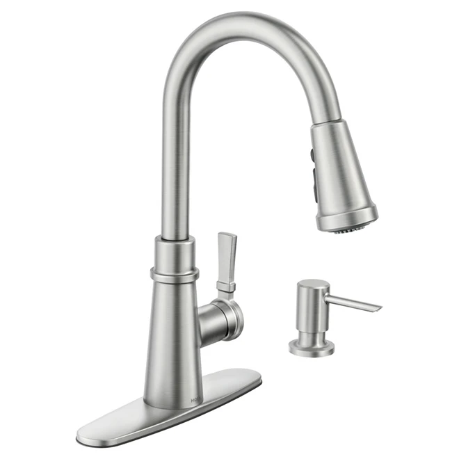 This elegant stainless steel Tullis kitchen faucet from Moen is equipped with a pull-down spout for a complete clean. The unique single lever handle makes it easy to adjust the water flow. Designed to be installed on sink or on the counter, this faucet has a flow of 1.5 gallons per minute with 4 different functions. For installation from 1 to 4 holes. Soap or lotion dispenser included. Limited lifetime warranty.