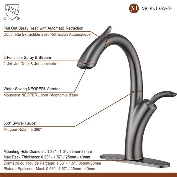 A blend of style and simplicity is the perfect way to describe the Mondawe kitchen faucet collection. Designed with a sleek architecture and simplistic lines, this deck mount sink faucet comes in a colourfast finish, making it durable to use in the bathroom, kitchen or laundry. The single handle design allows you to control the water temperature and volume easily while the 360 degrees swivel spout and pull down sprayer are extremely helpful for a wide range of use and effortless cleaning.