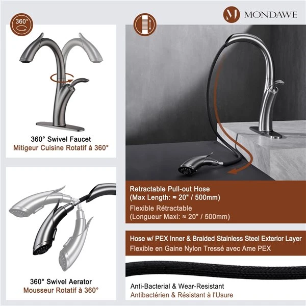 - 360 degrees swivel spout allows an unparalleled reach and effortless movement around the sink while the pull down sprayer can be extended up to 20 inches and retracts back automatically after use