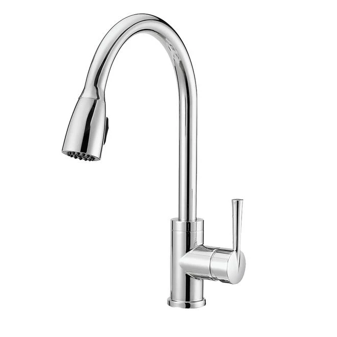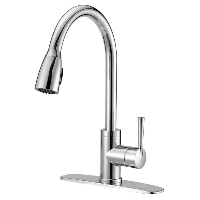 This Project Source kitchen faucet is made of lead-free brass and has a sparkling chrome finish that will revitalize the look of your kitchen. It’s equipped with a single handle lever and a pull-down spout with dual spray and stream functions that makes it easy to rinse the sink. Its ceramic disc valves ensure that this faucet will not drip, and it comes with extra-long supply lines to help eliminate the need for additional supply lines. Backed by a limited lifetime warranty.