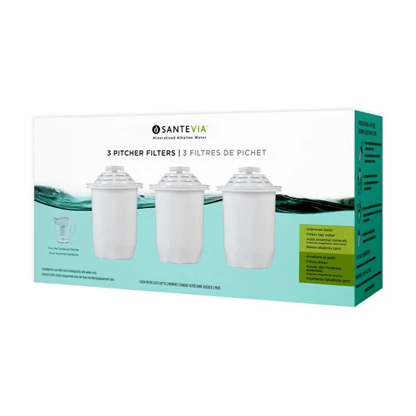 The pitcher filter fits the Santevia® alkaline water pitcher. This filter provides you and your family with clean eco-friendly, cost effective and mineralized alkaline water, just like nature intended. With the Santevia® alkaline pitcher filter, you’ll not only help maintain your body’s healthy pH balance, but you’ll also save money you would have spent on expensive mineral water in stores. Filter available in single and 3-pack.