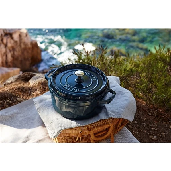 The Staub La Cocotte dutch oven is unsurpassed for slow-cooking meats and vegetables to tender perfection, and for simmering hearty stews and soups. Cast iron possesses exceptional heat-retaining qualities, so the pot heats evenly throughout. The innovative lid features tiny spikes on the interior that continually release condensed liquid back onto the food, yielding moist, flavourful results. Staub’s special matte black enamel interior and self-basting spiked lid guarantee perfect browning and braising for flavour-enhanced food. With their exquisite enamel finish, each piece transitions beautifully from the kitchen to the table. From comfort food to sumptuous suppers, every dish is special when served in this dutch oven. Staub enamelled cast iron cookware is the choice of the world’s best chefs.