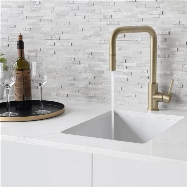 - Single handle that moves 90° to the front to allow ample range of motion and avoid hitting the backsplash