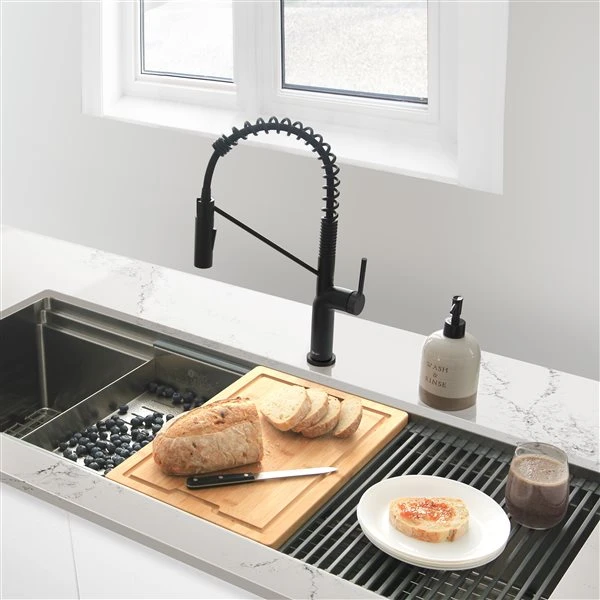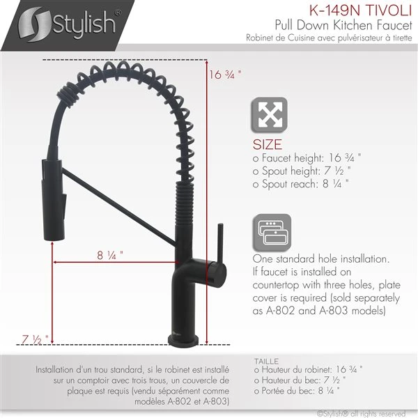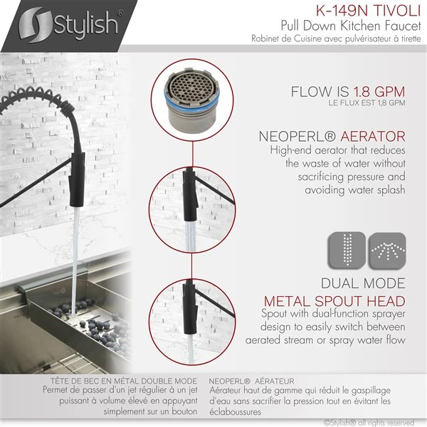 This faucet is made of 100% stainless steel and has been manufactured with top-quality components to ensure superior performance and durability. The pull-down, dual-action metal spray head on the single-handle kitchen faucet allows for your choice of aerated flow or powerful spray for all your kitchen needs. The 360° swivel spout extends up to 25-in, and its spiral details make it a highly functional and beautiful statement piece. This kitchen faucet is made of all solid stainless steel material and with high-quality components ensuring lasting value and superior performance. One of the high-performance components is an ultra-durable Kerox ceramic cartridge which has been tested for over 500,000 cycles. Also, includes a Neoperl aerator that reduces the waste of water without sacrificing pressure. This commercial-style kitchen faucet fits a standard 35 mm hole. Easy to install with a single hole countertop design.