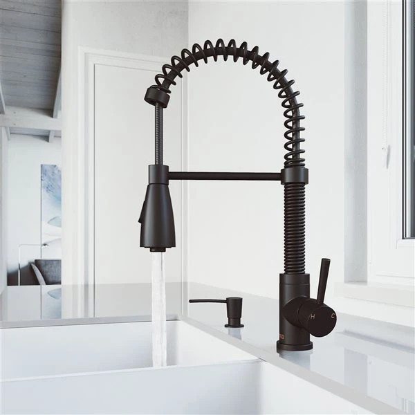 Form and function come together to create a stunning pull-down kitchen faucet with The Brant by VIGO. Taking inspiration from professional kitchens, the Brant gives utility new meaning with a design that tackles any kitchen task with elegance and grace. The multifunctional pull-down spray head delivers a stream or a powerful spray that makes it easy to wash away food and grease. VIGO’s premium hardware finish gives this matte black kitchen faucet a luxe smoothness that pairs well with any farmhouse kitchen sink or stainless steel kitchen sink. For added convenience the included soap dispenser makes dish soap, hand sanitizer, lotion or detergent easily accessible.