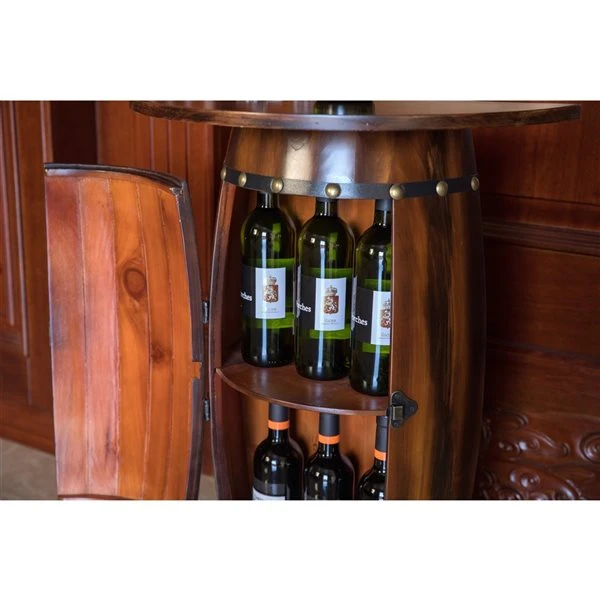 Complete the decor of any room with this vintage barrel shaped wine cabinet. Made of durable wood, this wine cabinet offers durability and function for continual use. The vintage wood, the rustic latch, the studded details and the barrel shape will add a decorative appeal. The top shelf provides extra space to store and display glasses and wine. Use this wine cabinet to store up to 10 wine bottles.