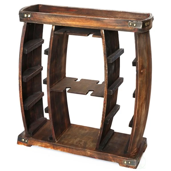 Complete the decor of any room with this vintage wine rack. Made of durable wood, this wine rack offers durability and function for continual use. The wood, studded details and sectioned racks will add a decorative appeal to any room decor. The top shelf provides extra space to store and display glasses and wine. The side rack offers space to store wine bottles and the centre rack provides enough space to store glasses. Use this wine bottle rack to store up to 8 wine bottles and keep your wine collection handy.