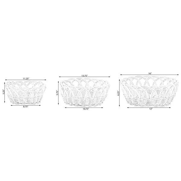 - Large: 16-in dia x 6.25-in H, medium: 13.75-in dia x 5.75-in H, small: 11.25-in dia x 5.25-in H
