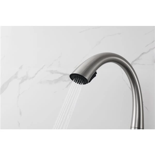 - The pull-down faucet head is recessed in the faucet spout when docked and pulls down easily when needed