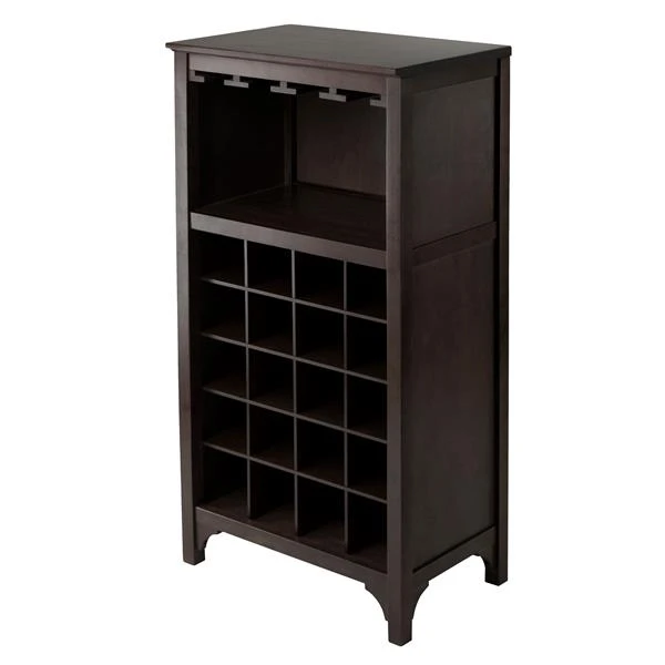 Add this compact Ancona wine modular unit to your home. Create a unique look with one unit or any combination of the three styles available. This unit has glass hanger and holds 20 bottles of wine. Made with combination of solid and composite wood in a dark espresso finish. Assembly required.