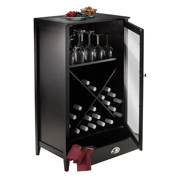 The Bordeaux modular wine cabinet with an X Shelf is a great addition to your home. The simple design has straight lines and a dark finish. Perfect storage piece for the wine enthusiast. The cabinet provides a spacious single drawer for your accessories, storage shelf and X shelf for your wine bottles that can store up to 24 bottles. Clear glass door with dark wood frame. Cabinet is made with a combination of solid and composite wood in espresso finish. Assembly Required.