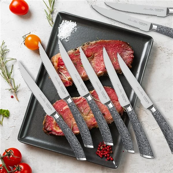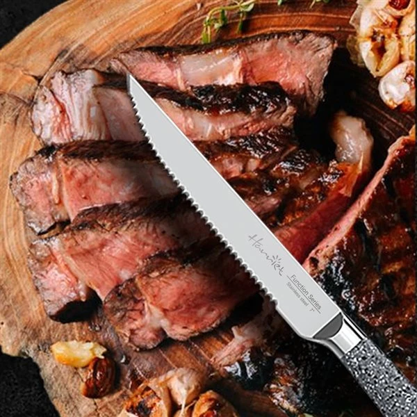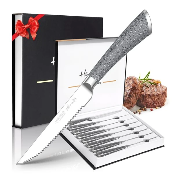 Premium German high-carbon stainless steel ensures its exceptional strength, durability, and stain resistance, strong anti-corrosion & rust-free abilities. The serrated edge is ideal for cutting steak, pork, and poultry.